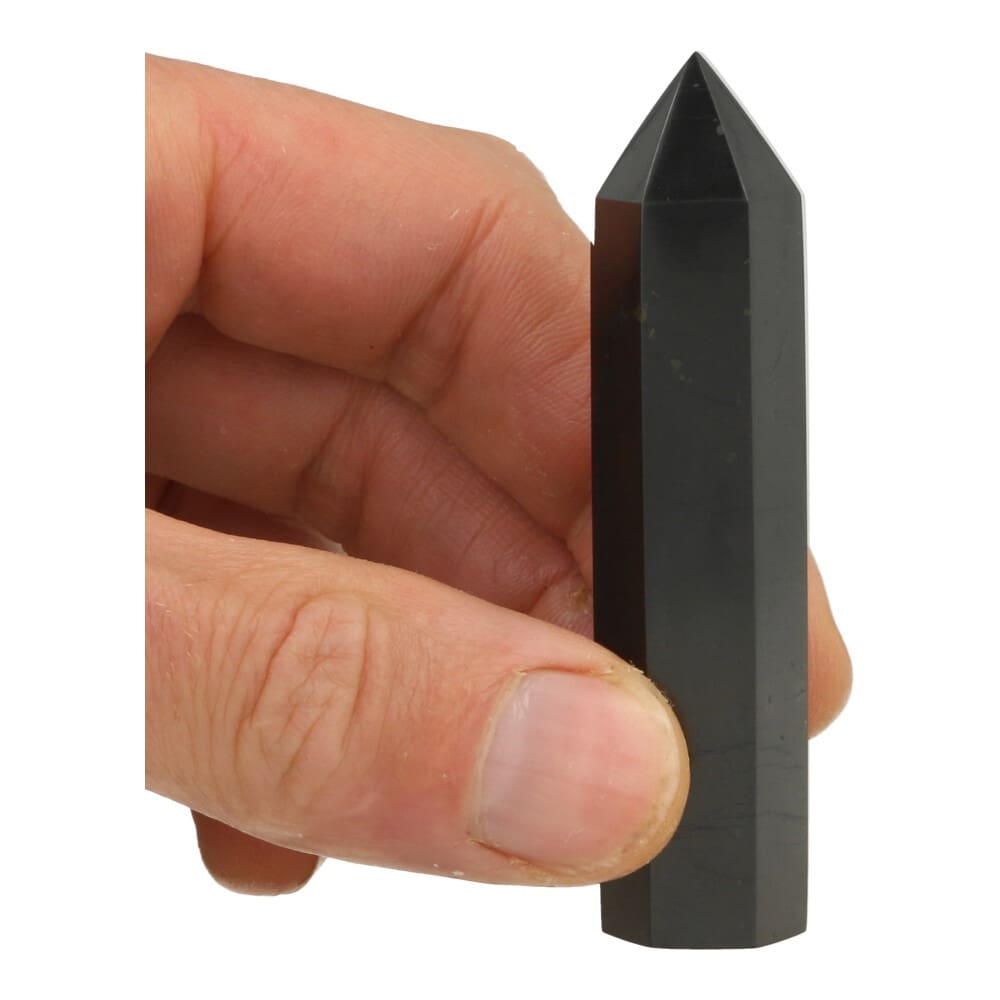 Glanzend zwarte shungiet punt van 8cm hoog en een basis van circa 1,5 x 2cm. Je ontvangt een soortgelijke shungiet punt als op de foto, we zoeken de beste voor je uit bij je bestelling.