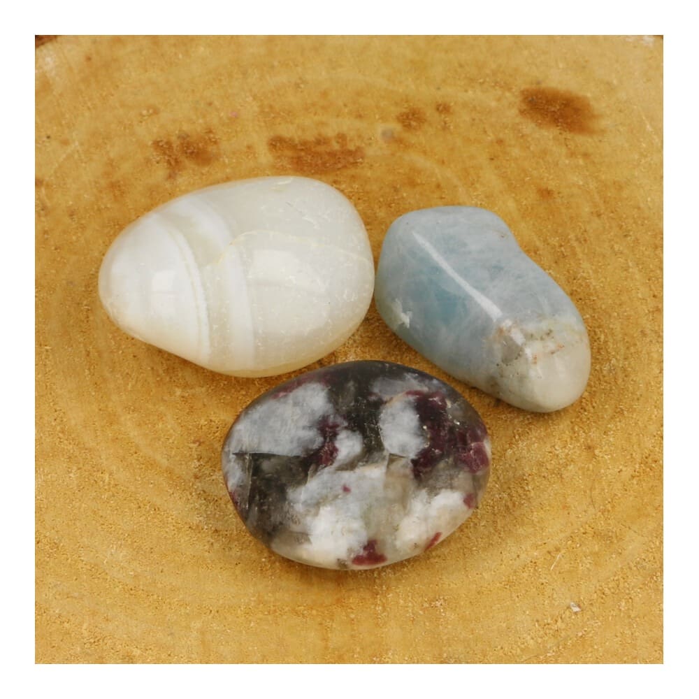 Deze set bestaat uit een gladde trommelsteen van aquamarijn, vredesagaat en rubelliet.