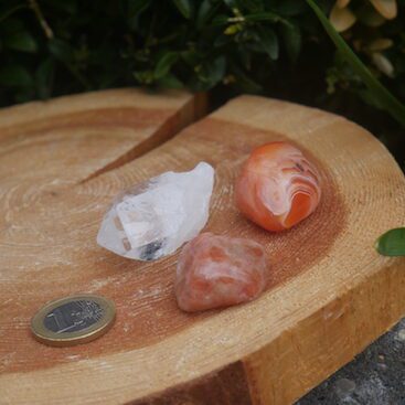 Focus edelstenen set trommelstenen. De set bestaat uit een helder stukje ruw bergkristal, een carneool en een zonnesteen trommelsteen. Fijne set voor een heldere blik, en persoonlijk samengesteld.