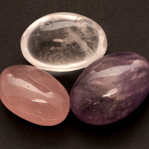 De gouden driehoek trommelstenen large bestaat uit rozenkwarts, amethist en bergkristal. Dit betreft maat large, drie mooie wat grotere trommelstenen. Ideaal voor het opladen van water, of om bij je te dragen. De maat van deze stenen is gemiddeld circa 4,5 cm hoog en ongeveer 3,5 cm. Zie ook de trommelstenen small en medium.