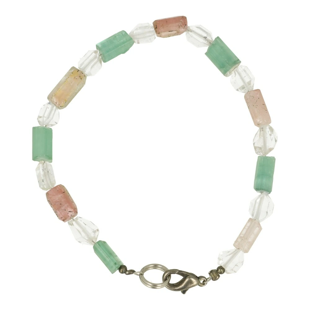 Fraaie A-kwaliteit High Energy armband ‘nr3’ met blauwe toermalijn of indogoliet, roze toermalijn en Pakistaanse ‘Herkimer’ diamonds. De armband bestaat uit prachtige heldere, ruwe kristallen en stukjes met hoge energie en helderheid. De armband is geregen op staaldraad en de lengte past bij een polsomtrek van ongeveer 16-18cm. Je ontvangt de High Energy armband van de foto. Deze combinatie van zeldzame mineralen maakt de energie helder en fris, met de focus op het verdieping in jezelf en transformatie. Een echte booster voor je energie en spirituele groei. Hieronder is de werking van blauwe toermalijn beschreven. De roze toermalijn voegt een energie van zachtheid en een milde blik toe, terwijl de Pakistaanse ‘Herkimer’ diamonds helderheid brengen en de werking van de roze en blauwe toermalijn versterken. Een unieke armband!