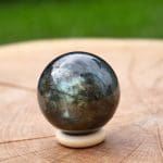 Mooi formaat labradoriet bol met een diameter van 40mm (4cm). Je ontvangt een soortgelijke bol als op de foto inclusief houten ringetje. Iedere bol heeft een mooie glans en dezelfde maat. We zoeken de meest positieve voor je uit bij je bestelling.