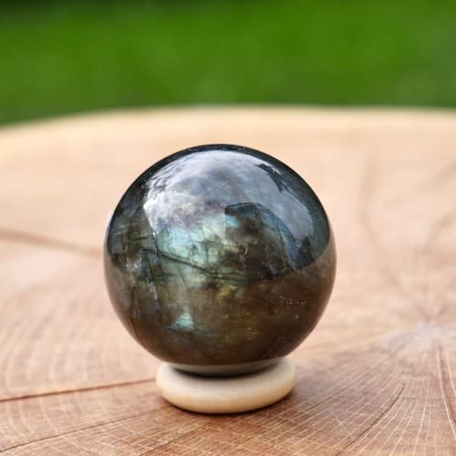 Mooi formaat labradoriet bol met een diameter van 40mm (4cm). Je ontvangt een soortgelijke bol als op de foto inclusief houten ringetje. Iedere bol heeft een mooie glans en dezelfde maat.