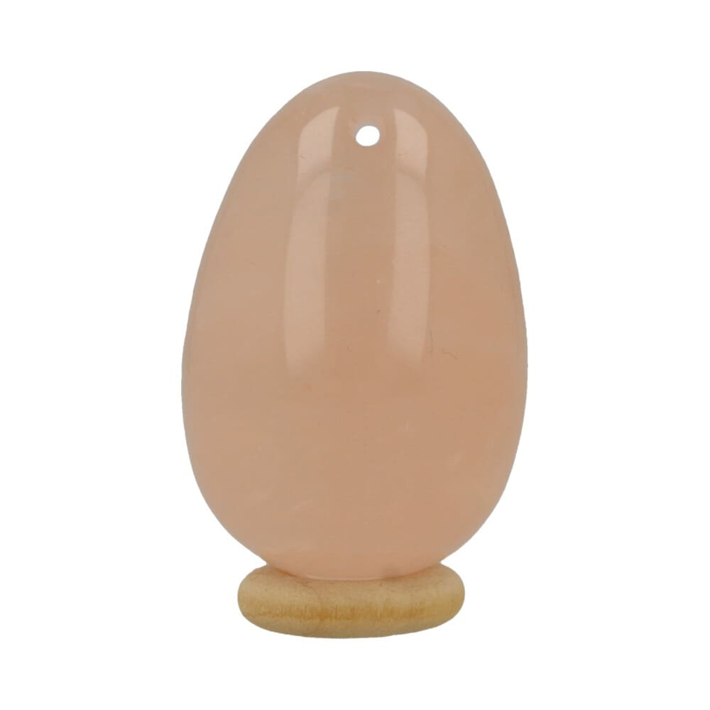Zachte rozenkwarts yoni ei met een gaatje. De afmeting van dit rozenkwarts yoni ei is ongeveer 45mm hoog en 32mm diameter. Het gaatje aan de bovenzijde dient om een touwtje door te doen als je dat prettig vindt. Je ontvangt een soortgelijke rozenkwarts yoni ei als op de foto, inclusief houten ring. Lees meer over het gebruik van yoni eieren op de pagina yoni ei.