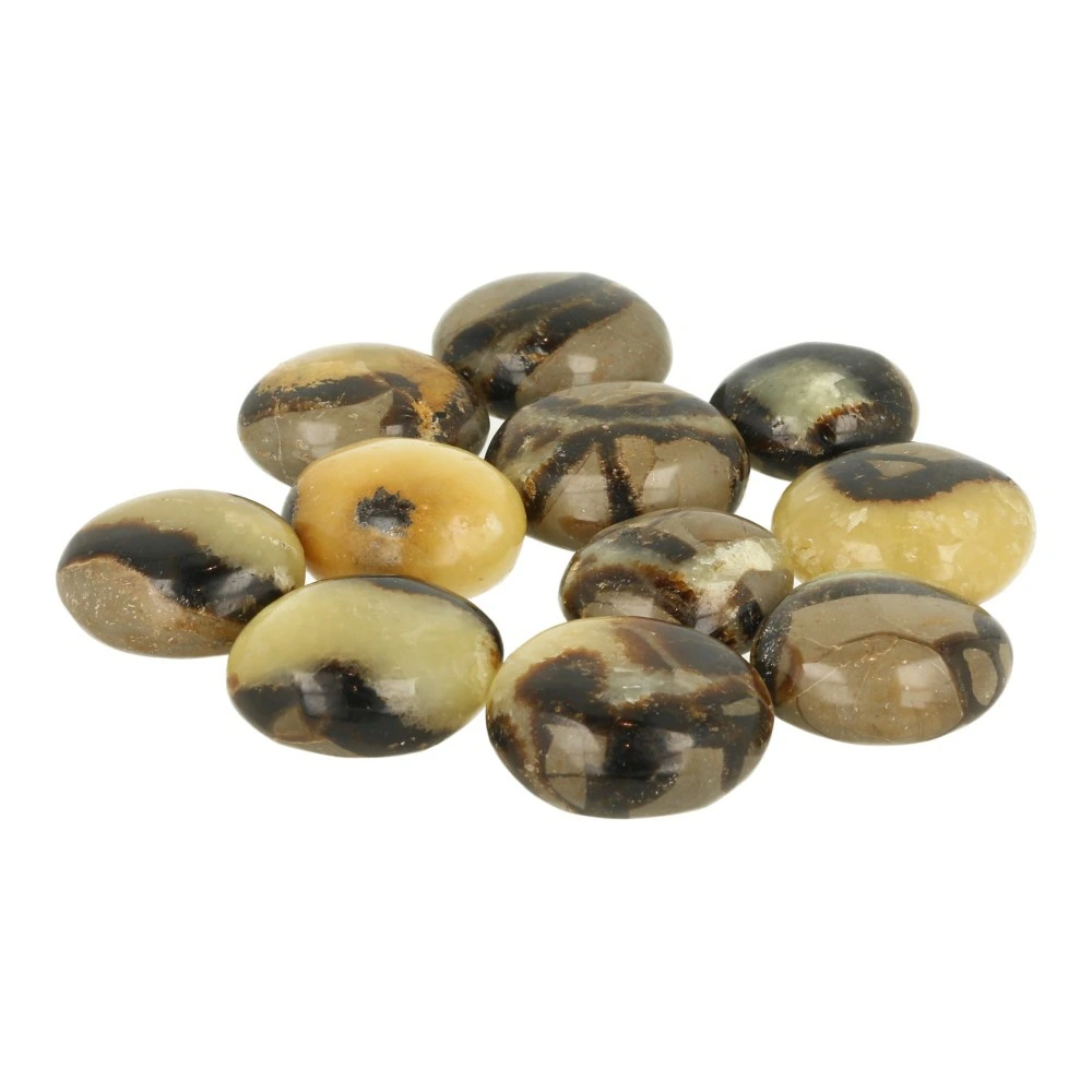 Fijn formaat septarie trommelsteen met mooi lijnenspel uit Madagaskar. Je ontvangt een soortgelijke septarie trommelsteen als op de foto, de vorm en tekening van iedere steen is anders. De afmetingen variëren, deze septarie trommelsteen is vrij rond en plat van vorm en ongeveer 2,5 – 3 cm diameter en 1-1,5cm dik.