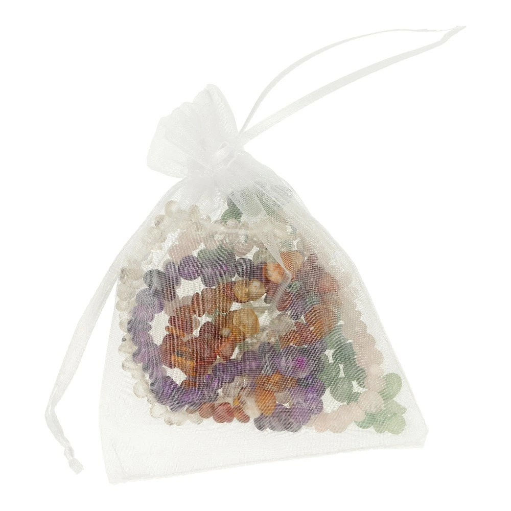 Fraaie set van 5 splitarmbanden, bestaande uit een splitarmband van groene aventurijn, carneool, amethist, tijgeroog en bergkristal. Deze splitarmbanden zijn geregen aan rekbaar koord en bestaan uit kleine gepolijste steentjes (split). Je ontvangt een soortgelijke set als op de foto. De lengte is het beste passen bij een polsomtrek van 15-17cm.