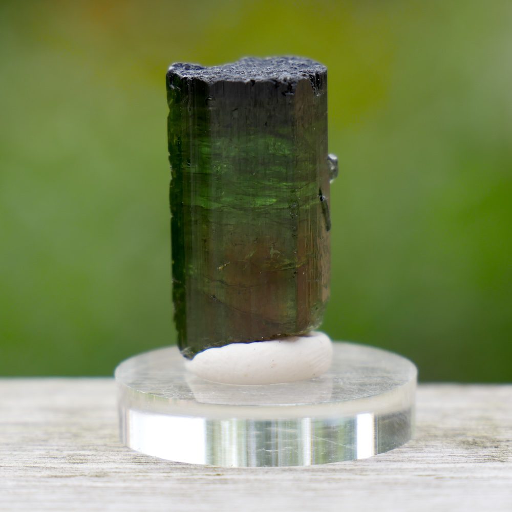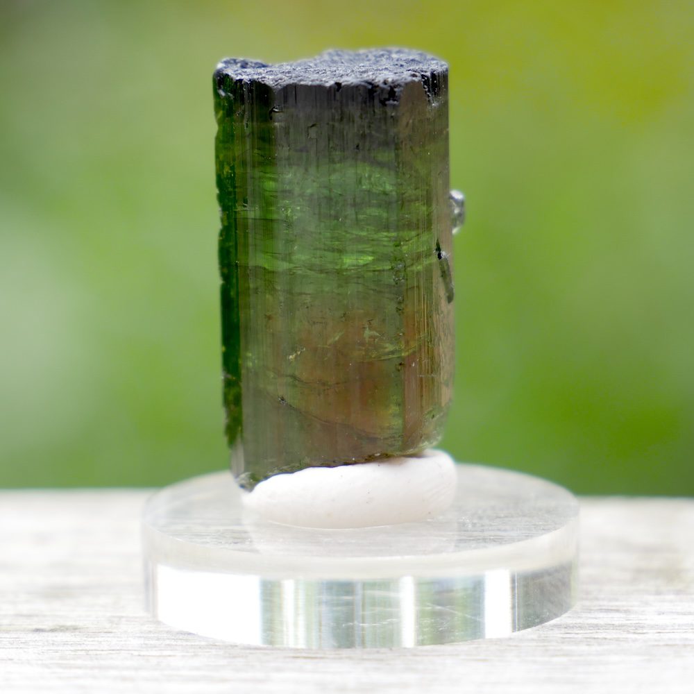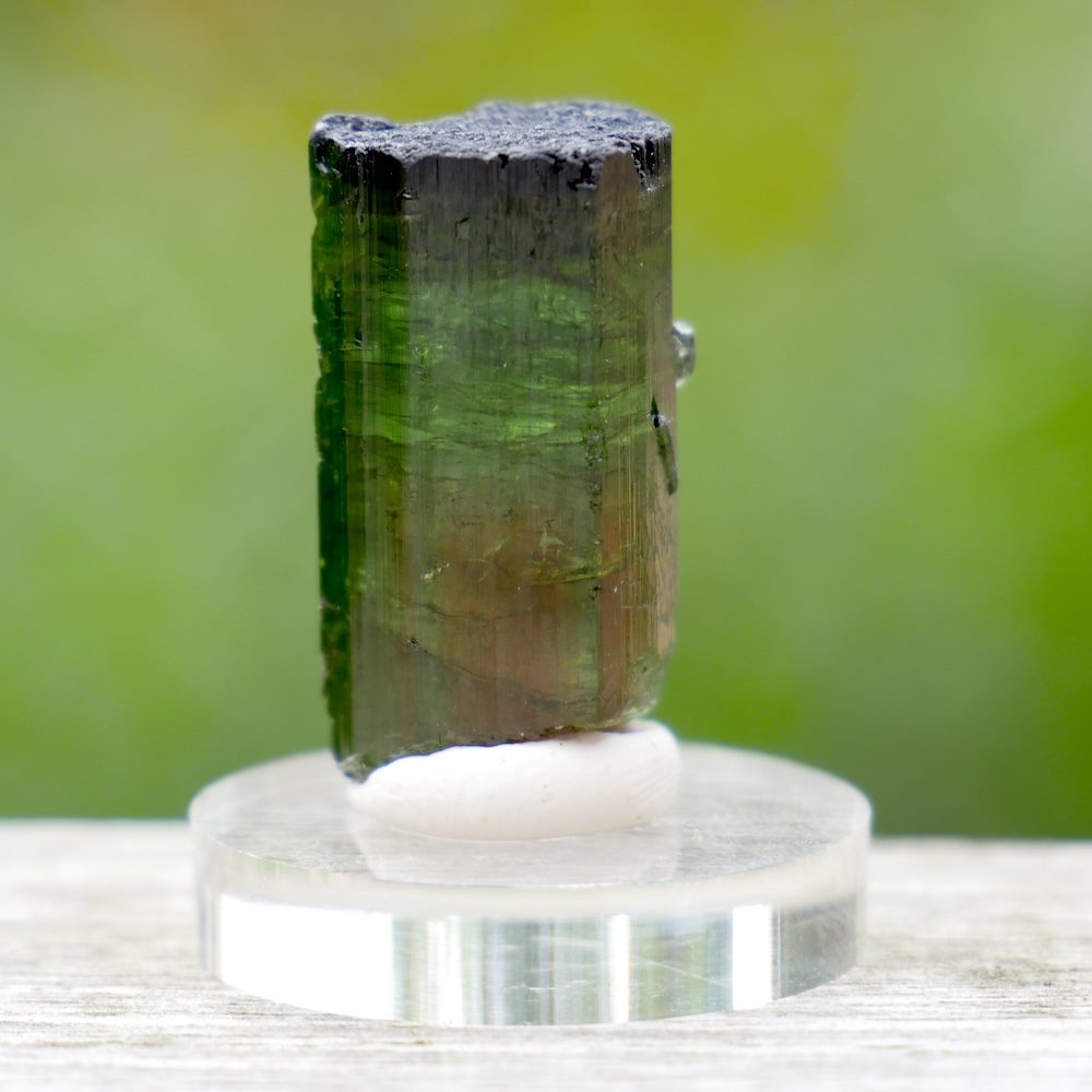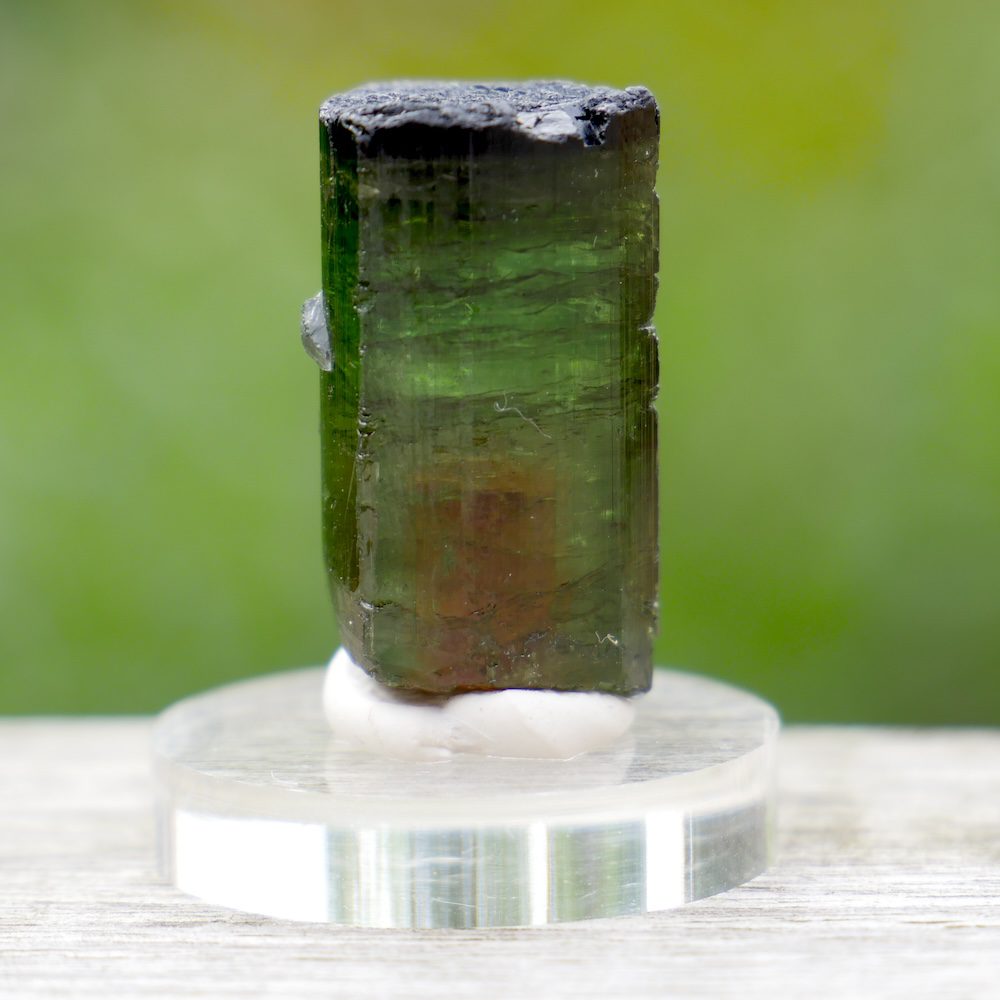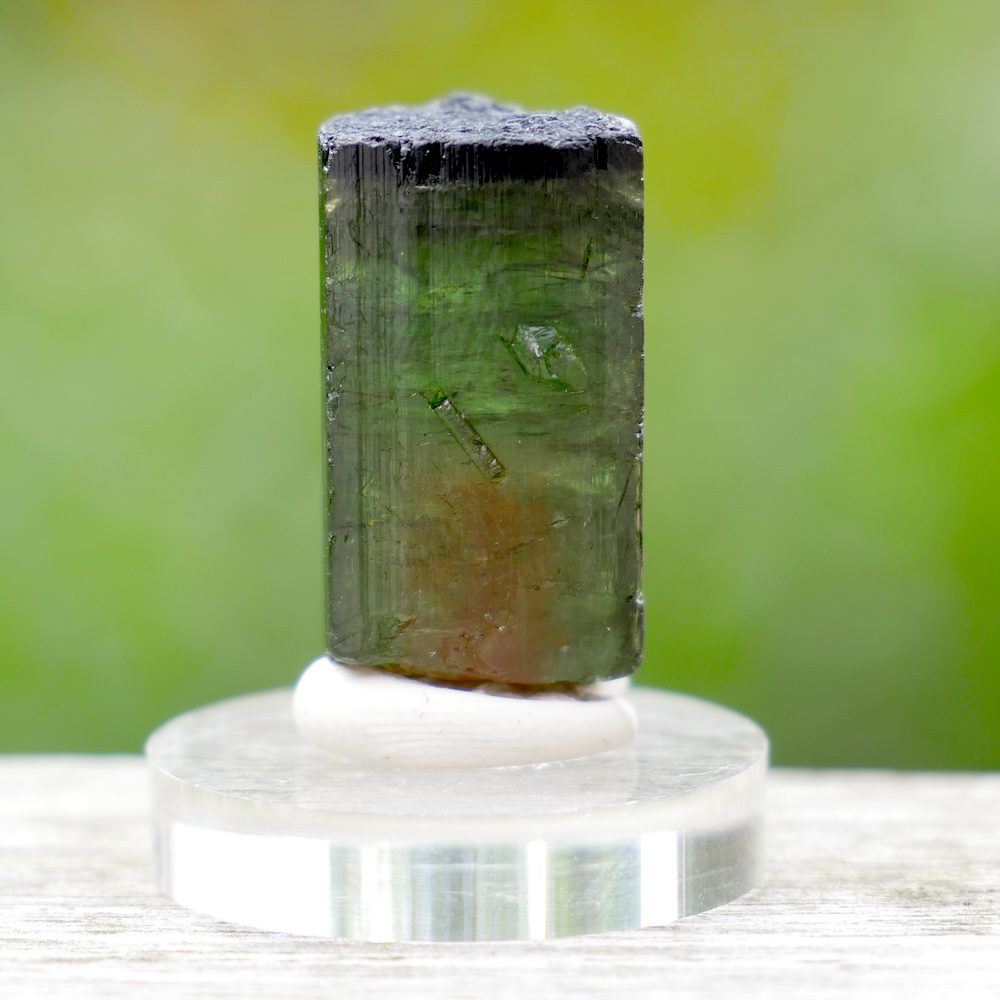 Topkwaliteit watermeloen toermalijn kristal op rond voetje van plexiglas. Dit watermeloen toermalijn kristal heeft aan het onderste deel van het kristal de watermeloen, rood van binnen en groen van buiten. De bovenste helft van het kristal heeft meerdere kleuren groene toermalijn. Je ontvangt het watermeloentoermalijn kristal van de foto. De afmeting van het watermeloen toermalijn kristal is ongeveer 24mm hoog, met een doorsnede van 13 x 13mm.